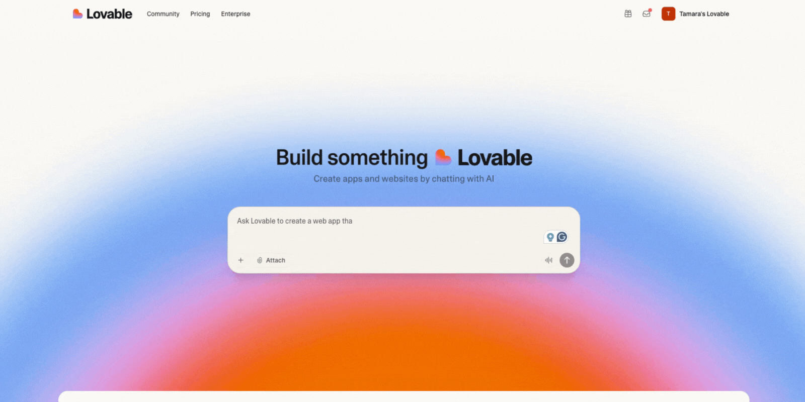 Visually, Lovable’s website is a standout example of modern tech website design. A fluid gradient background shifting from blue to pink and orange instantly captures attention, creating a sense of movement without overwhelming the content. It’s a visual metaphor for what the platform represents: progress, accessibility, and collaboration.