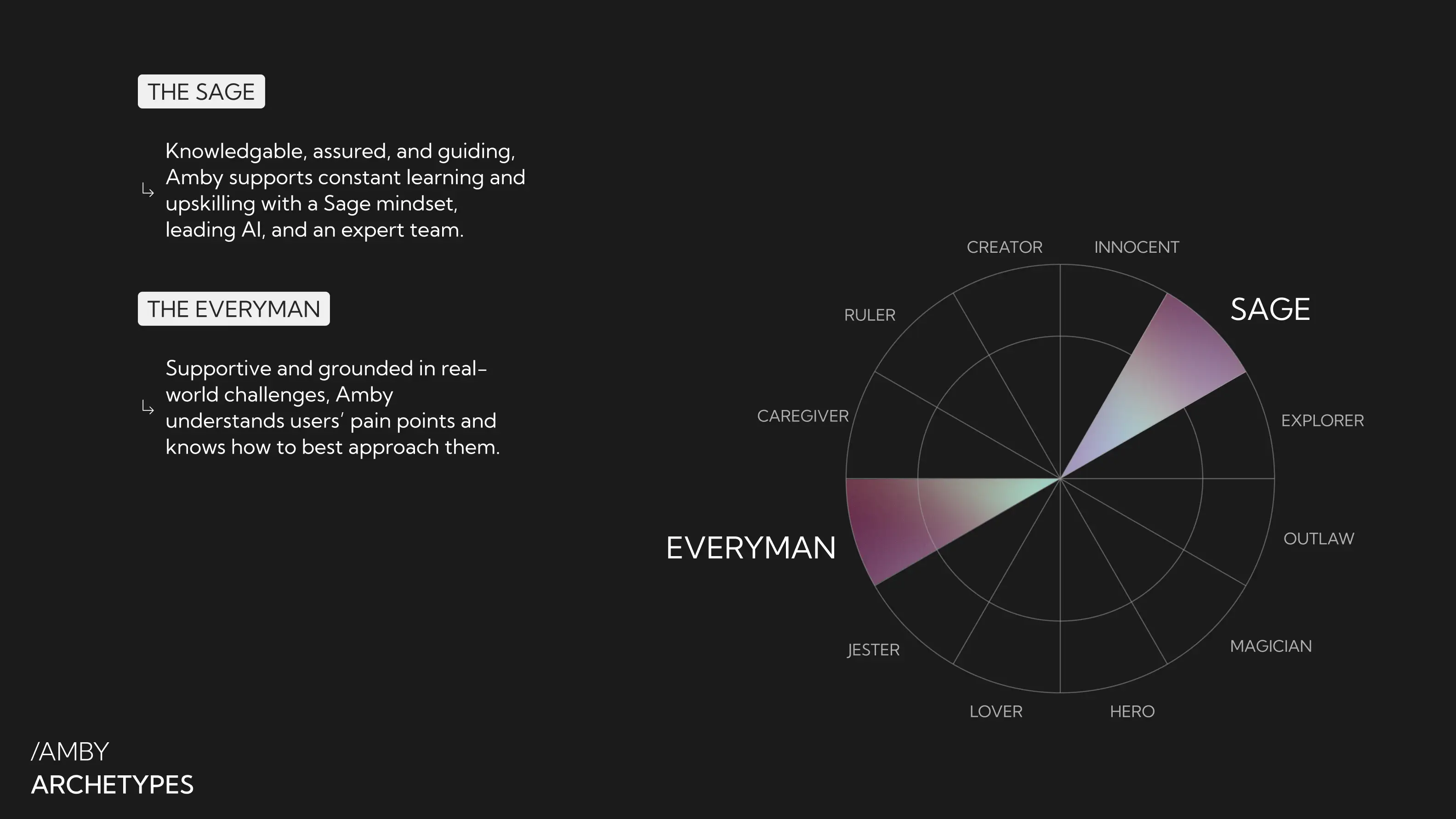 Amby imagines a future where AI and humans collaborate to keep machines running. This direction anchors the brand narrative: AI for the people who keep machines running. Based on the archetypes of The Sage and The Everyman, the brand identity communicates a progressive tech solution for the industry while staying deeply human and understanding. Knowledgeable, assured, and guiding, Amby supports constant learning and upskilling with a Sage mindset, leading AI, and an expert team. Supportive and grounded in real-world challenges, Amby is the Everyman that users can rely on.