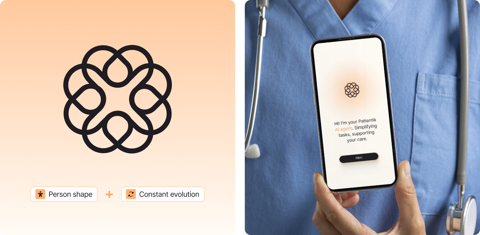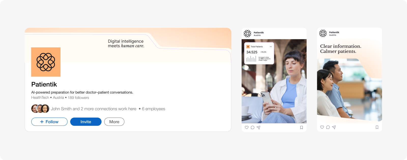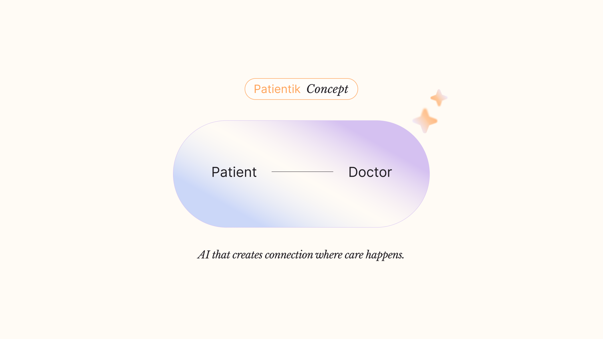 Patientik develops AI solutions that connect doctors and patients and improve the quality of medical consultations. Based on this value proposition, the branding concept centers on the idea of connection. This idea becomes visible through connected lines and shapes within the visual system. The different audiences are represented through color: blue for patients and lavender for doctors. A primary orange tone introduces warmth and expresses empathy, support, and care.