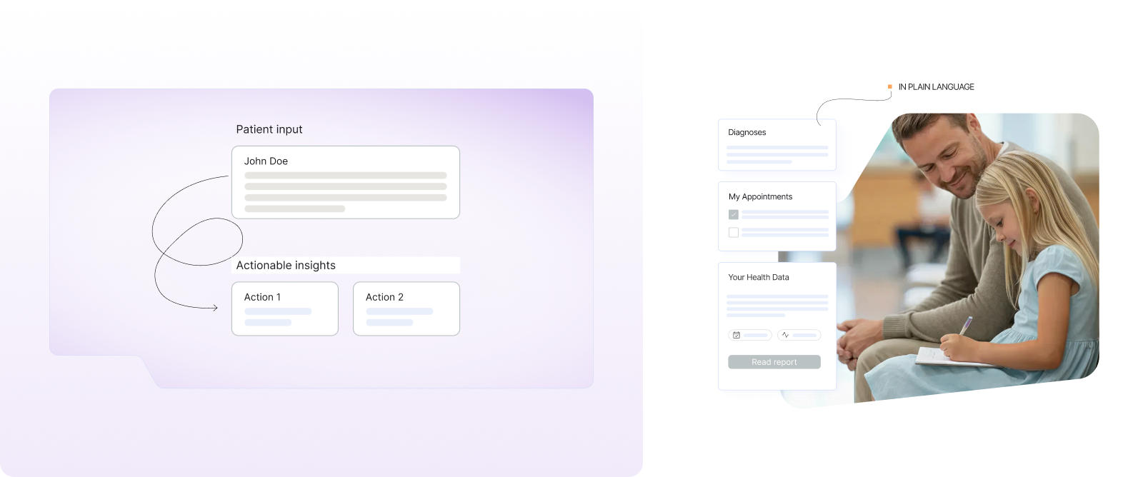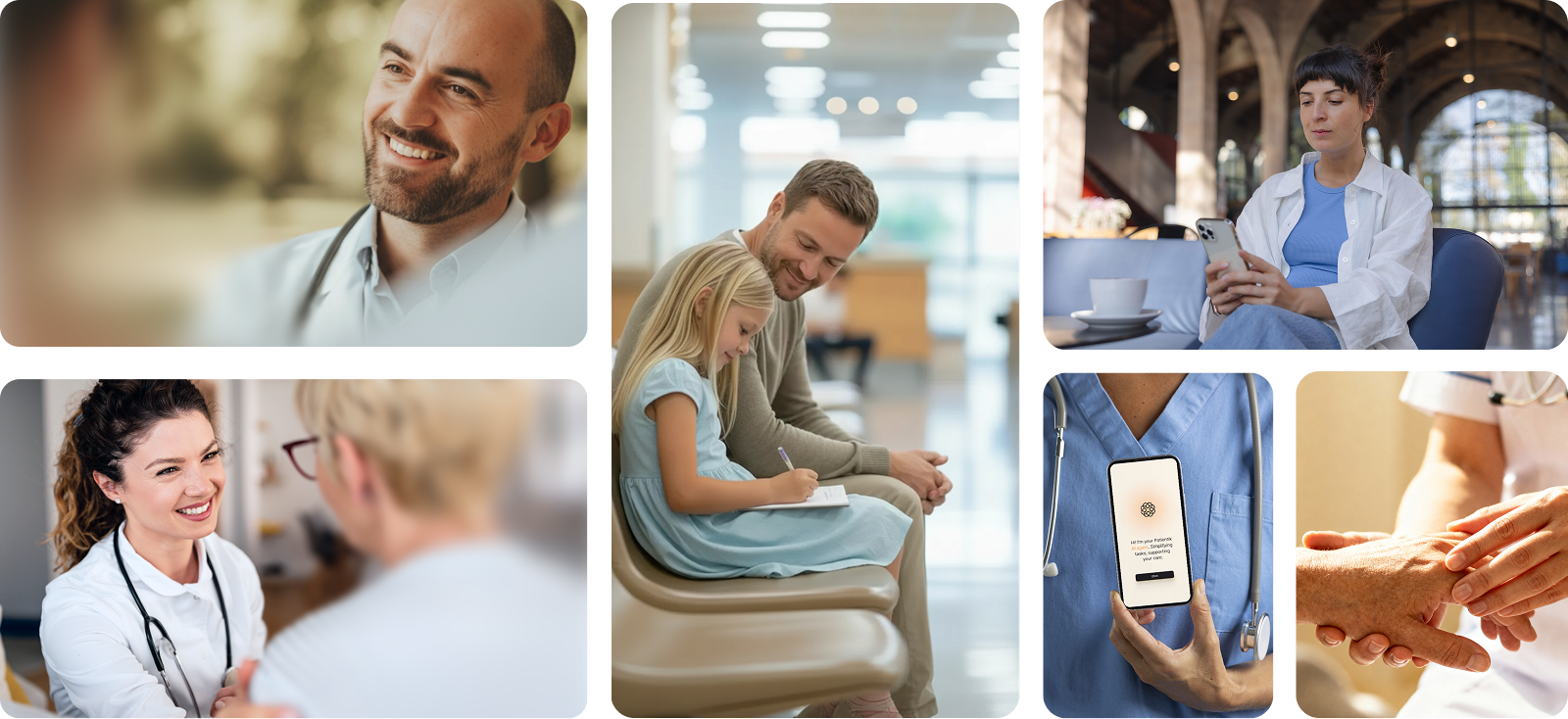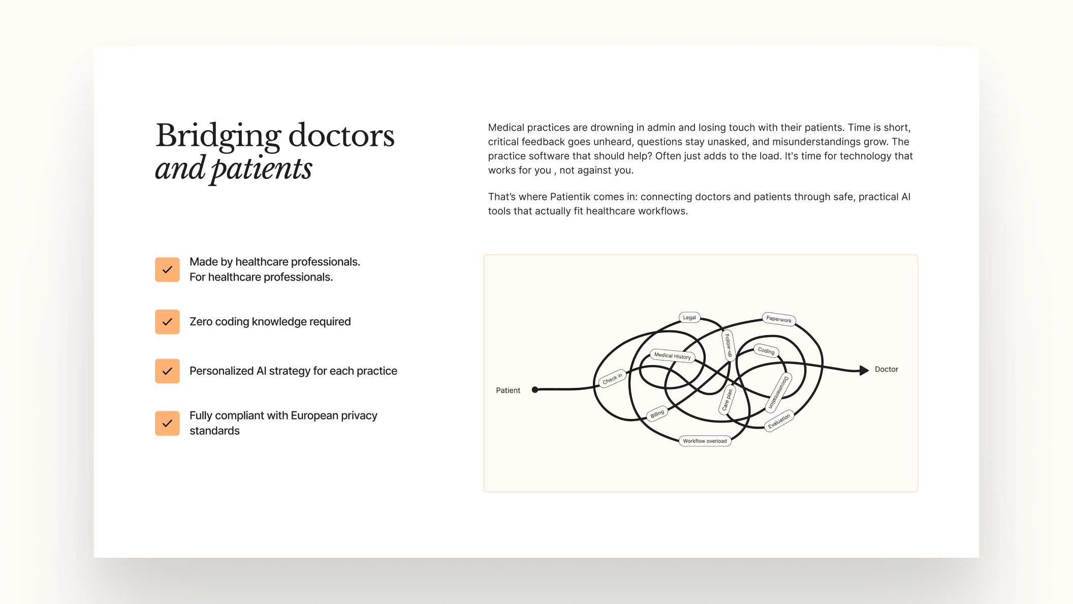 Patientik develops AI solutions that connect doctors and patients and improve the quality of medical consultations. Based on this value proposition, the branding concept centers on the idea of connection. This idea becomes visible through connected lines and shapes within the visual system. The different audiences are represented through color: blue for patients and lavender for doctors. A primary orange tone introduces warmth and expresses empathy, support, and care.