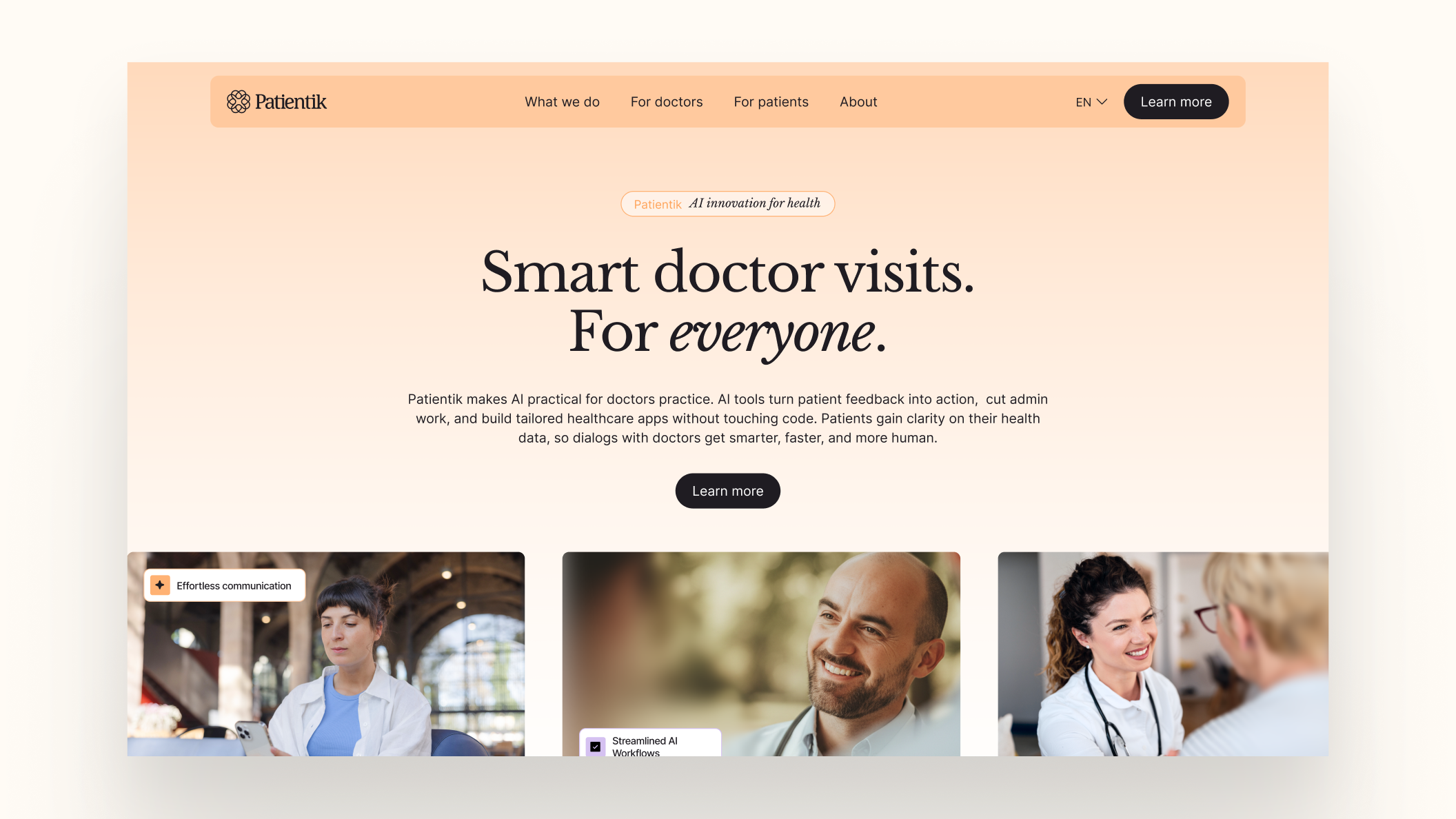 Patientik uses AI to improve healthcare experiences. Through intelligent solutions, the startup connects doctors and patients, helping create more time for meaningful care and increasing the understanding of medicine and health data.