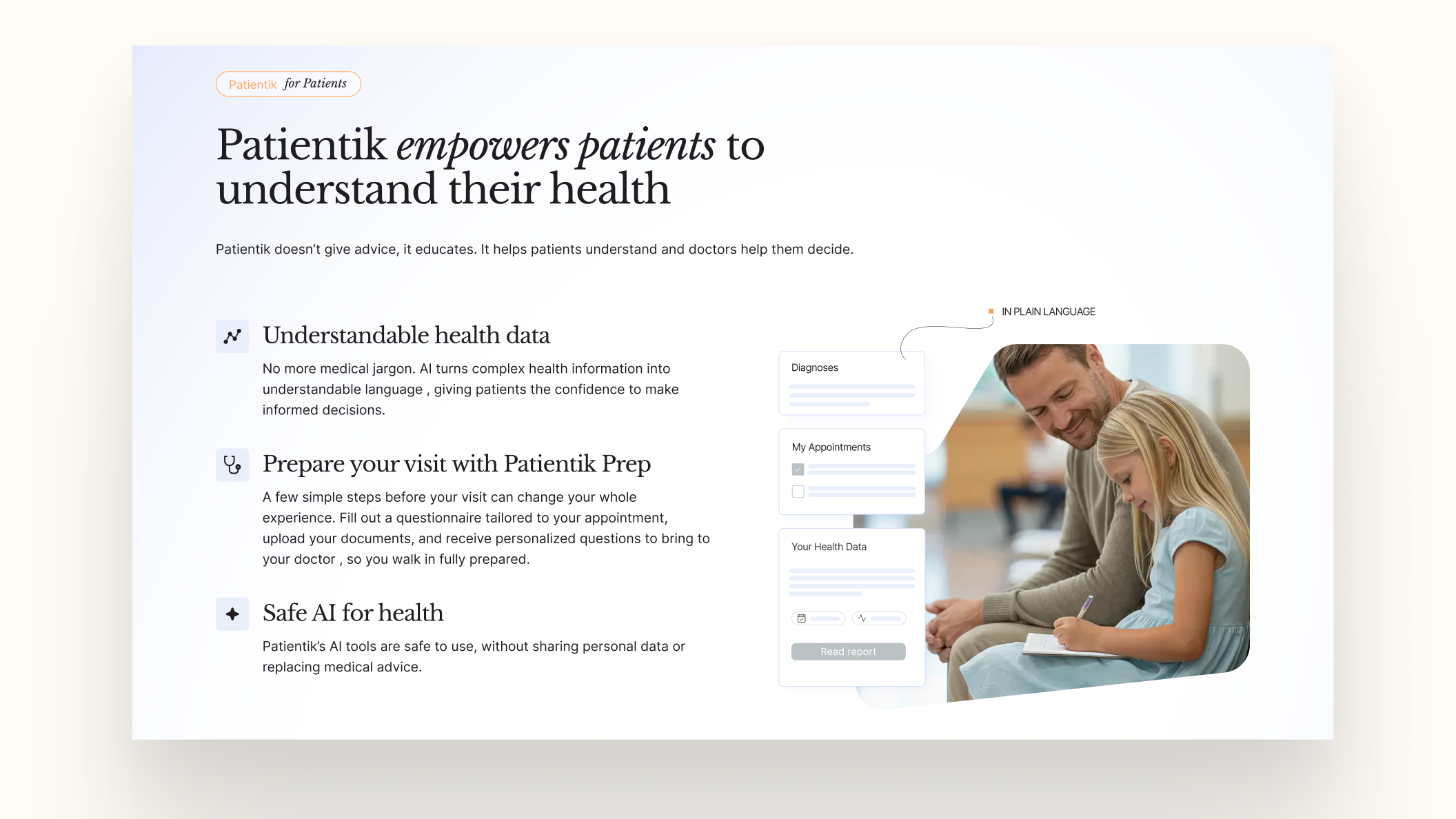 The website presents the health tech startup through an approachable and structured visual experience. Soft pastel backgrounds create a calm atmosphere, while strong typographic contrasts guide attention through the page. Patientik’s visual identity communicates a trustworthy, human-centered brand that still reflects the technological precision of an AI-driven healthcare solution.