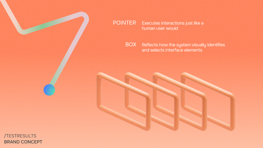 Most branding for tech companies in the software testing space feels rigid and dense. To stand out, TestResults needed a visual identity that felt progressive and approachable without losing the sense of precision required for enterprise tools. The core storytelling revolves around two literal elements: the box and the pointer. This isn't just a metaphor; it represents the software’s logic. The box shows how the system identifies interface elements (buttons and fields), while the pointer executes the action. It is a direct visual translation of a tool that "sees" like a human.