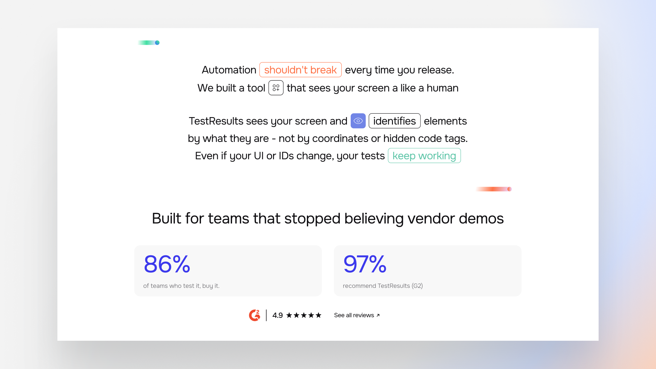 A brand promise that sounds “too good to be true”. TestResults tests software by navigating the screen exactly as a person would, rather than interacting with the backend code. Before the rebrand, the company struggled to communicate this "visual steering" technology; prospects found the concept hard to visualize and believe. We closed this perception gap by building a brand identity that mirrors the platform's value.