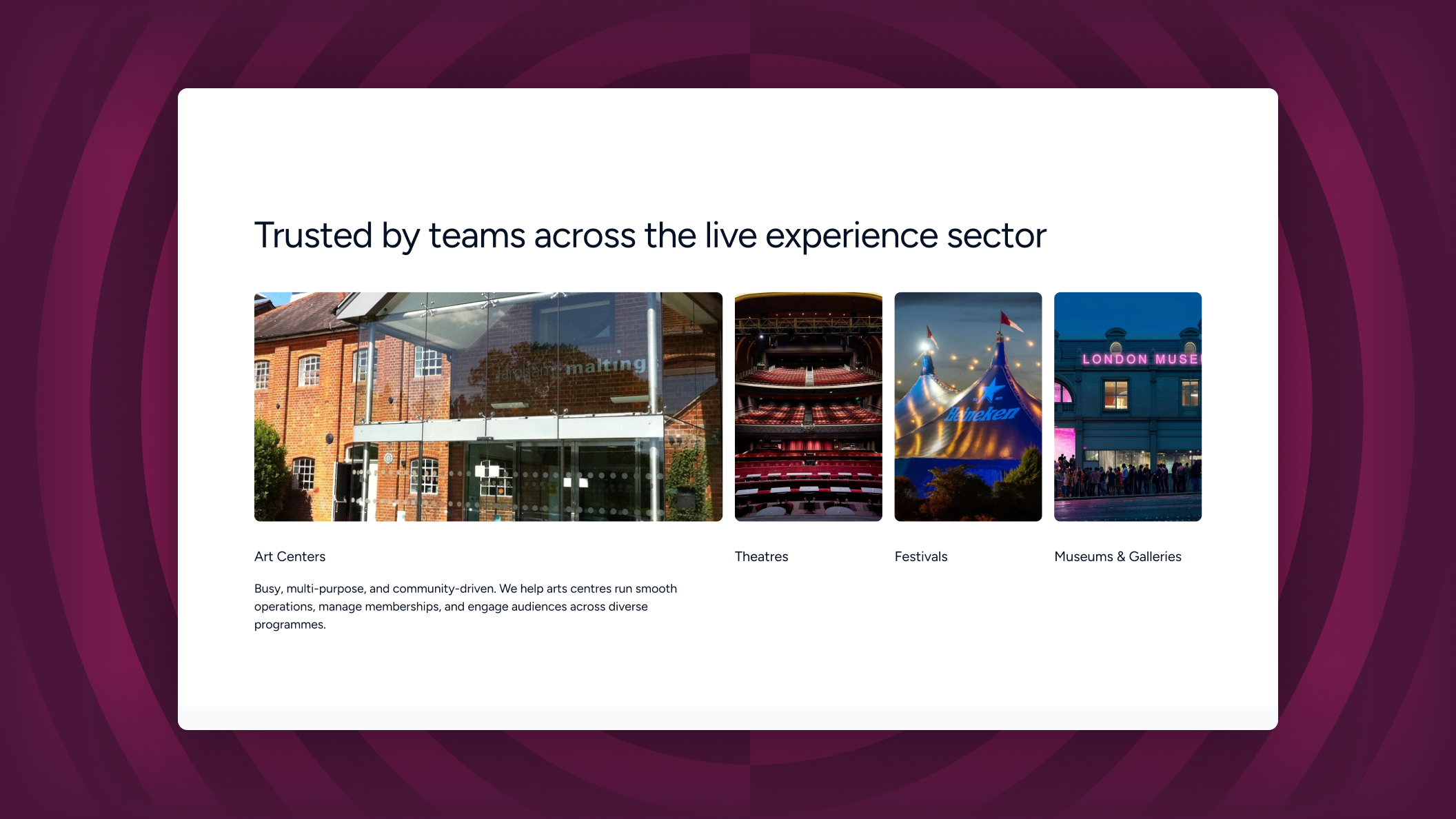 Ticketsolve set out to correct a perception gap. Despite offering end-to-end solutions for arts, culture, and event organizations, the company was primarily seen as a ticketing tool. The rebranding and website redesign focused on redefining this narrative, aligning the brand’s visual and verbal identity with its expanded role across multiple departments and use cases.