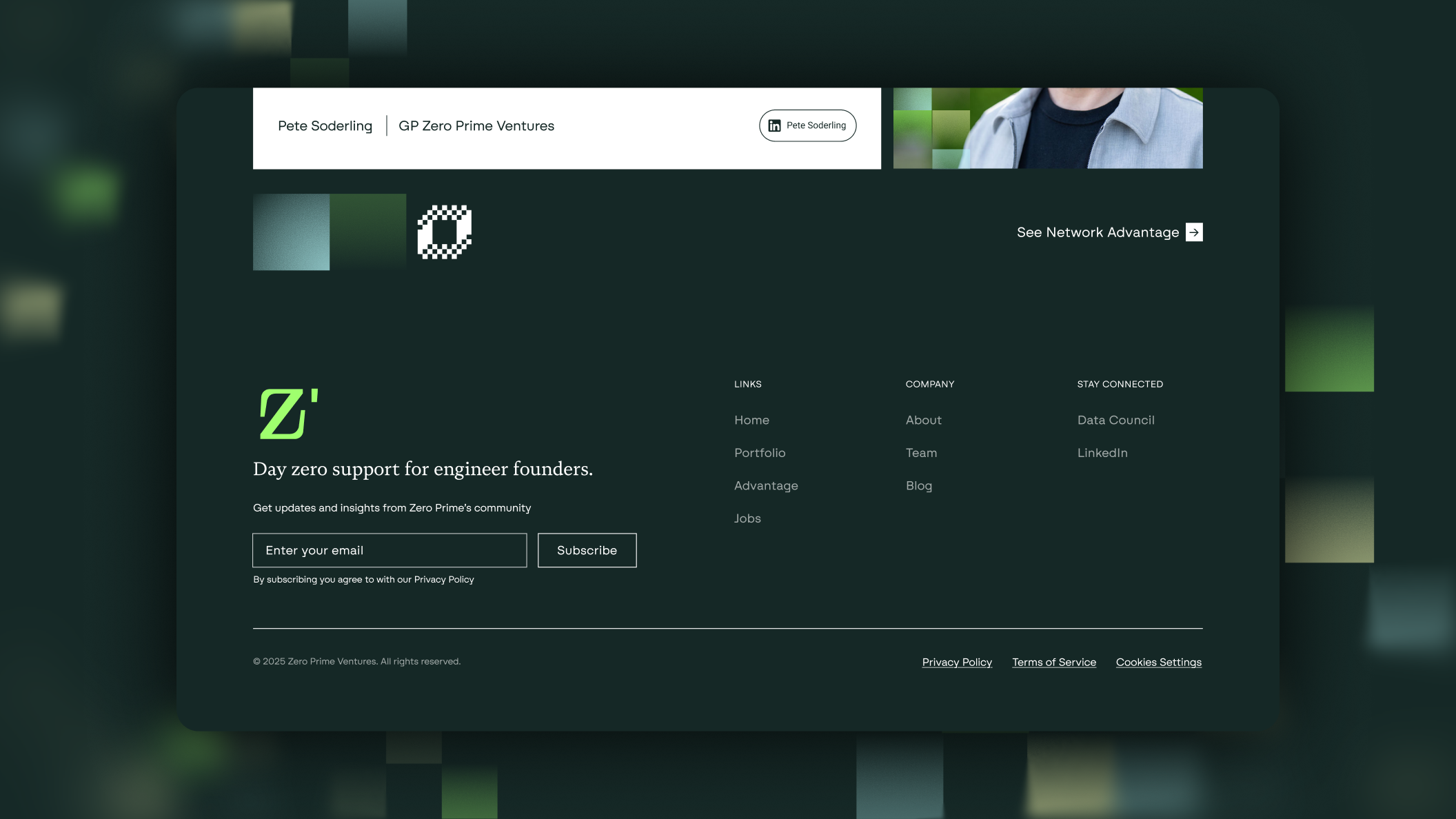 The website was designed for speed, clarity, and a highly technical audience. Layouts prioritize structure and hierarchy, making the investment thesis and value proposition immediately legible. Subtle motion in the above-the-fold brand shapes adds depth without competing with the copy. A beige base creates a sense of trust and stability, while Deep Teal and Zero Prime Green accents guide attention across key interactions. The result is a focused, credible web experience aligned with the expectations of AI and data founders.